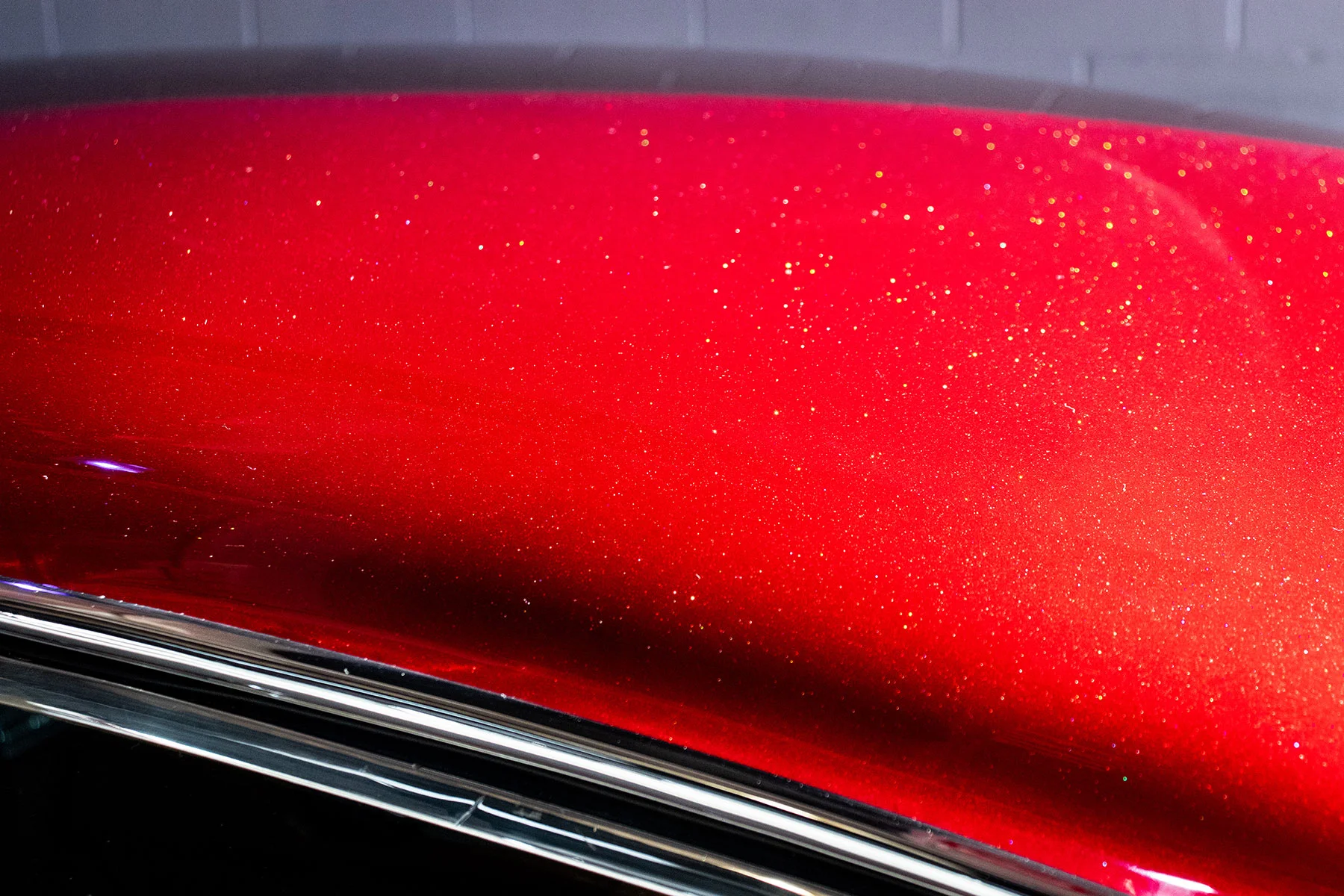 This incredible and unique custom 1968 Jaguar E type is a one of a kind tribute to the swinging 60s, but pulled together with a contemporary and timeless execution. The owner Nick spent countless hours creating and planning the stretched and smoothed bumpers, streamlined body modifications, custom in bumper lighting and recessed rear license area. Ultimately these features enhanced and added to the body that Enzo Ferrari said was “the most beautiful car ever made”. How do you change and modify a car that is already stated to be the best? We feel that this is how you do it. Keep the best parts of the lines of the car, and then smooth and tuck everything to make it look even faster and lower. The original Jaguar engine was modified and updated with modern high output charging system with custom brackets, a high output air conditioner was added to help keep you ice cold in the summer. Nick came to us here to help him bring his ultimate vision to life, and expertly apply the House of Kolor Candy Apple Red paint. He also asked for our help with the custom built polished stainless exhaust and much of the final assembly. The car came to us in primer ready for the final blocking, final coat of primer and then paint. We blocked the body down with 150, baked and cured all panels, then hand sanded the body. After sanding, the body was masked and sprayed with 3 coats of DTS primer sealer, and 2 coats of HOK Silver Sealer, and finally 4 coats of Orion Silvermax Base coat. This Base coat was allowed to dry for a day and then was hand sanded and detailed for super smooth base under the candy. The final coats of Silvermax were sprayed, then 6 coats of HOK Urethane Candy Carrier expertly applied. On top of the candy 3 coats of USC 01 were sprayed, after they were left to dry for a few days, it was hand blocked with 800 to a perfectly smooth finish. Finally one more round of clear coat gave us the smooth as glass final product. Once the paint was completed we let it dry, then color sanded and buffed smooth. Nick then had us finish the final assembly, build the exhaust and do some of the other final work. Overall the final color and quality of the paint job really set this car over the top. Each curve and line of the car is accented and highlighted by the deep rich low tones of the red candy and the bright accents of the Silvermax shining through in the sun.