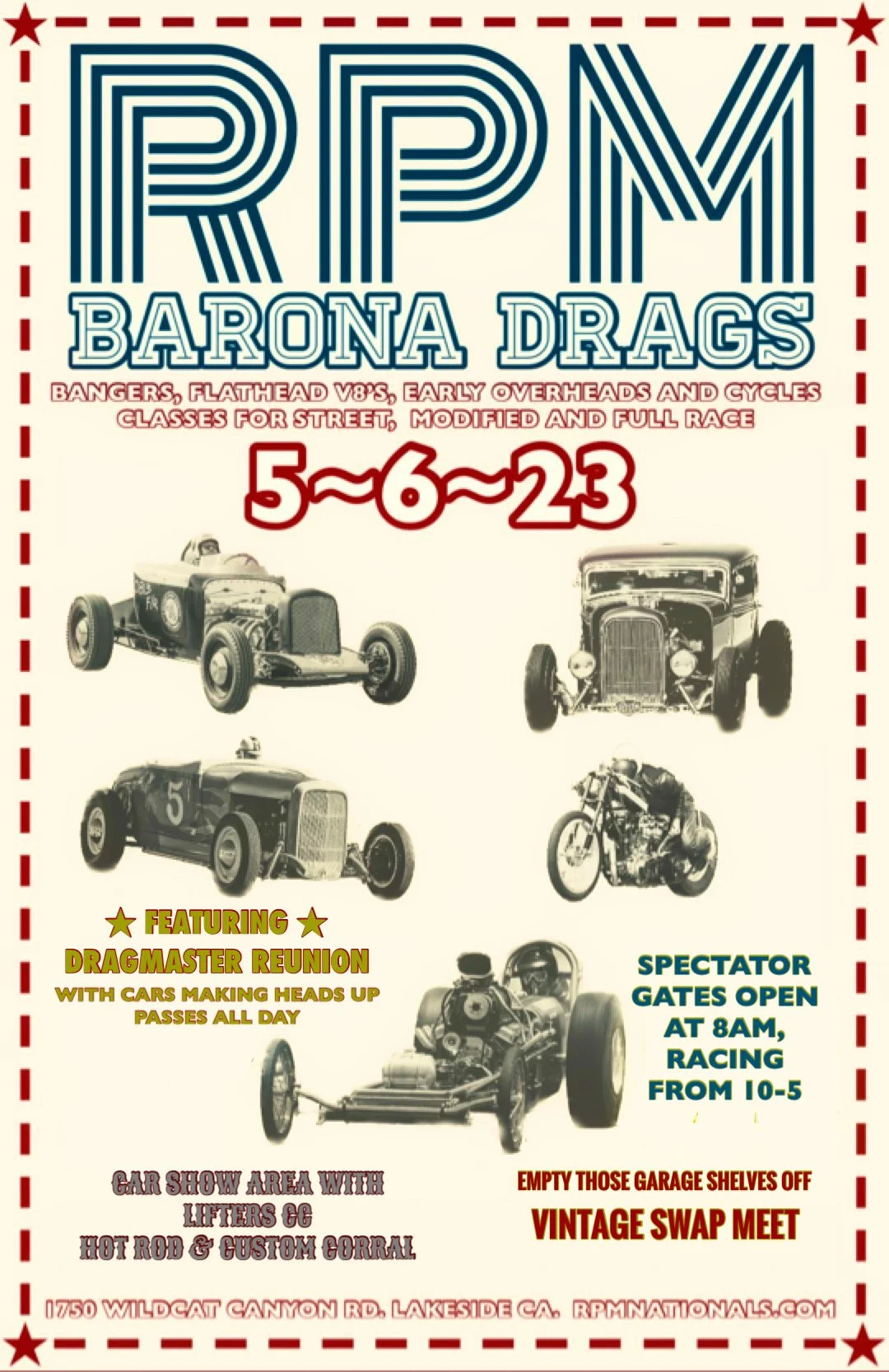 Since year one of rpm nationals we’ve been asked about running later overheads, the answer at RPM nats at Santa margarita ranch has always been “no”. Simply put RPM at the ranch will always be a flathead v8 and banger only race, that was our original goal and we’re stuck in our ways but since “you asked for it” we decided to look into a venue that can accommodate faster cars. What we found was Barona drag strip in San Diego county, it has that old timey feel but is setup with all the safety requirements to run faster cars. So we’re introducing the “you asked for it drags” .